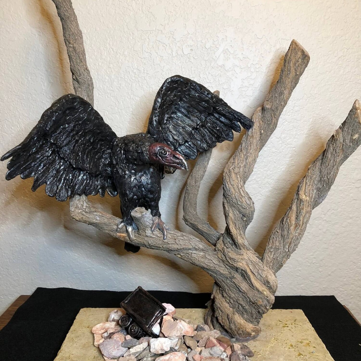I found myself intrigued by the hanging tree and the implication of the vultures roosting there. Were they a deterrent to men contemplating stealing riches from the mine or were they simply the clean up crew hanging in the branches? Vulture City is an unusual name for welcoming residents but maybe the vultures were mascots guarding the miners and their gold? Is the vulture in this sculpture ready for flight or just settling in to keep watch? The sculpture is constructed of nylon fiber clay over an armature. It is covered with a sealant and finished with acrylic paint.The hanging tree branch is local hardwood, gnarled and twisted as the old tree appears. The trolley sits upon a pile or “ore” from the mine. It is sprinkled with “gold” flecks depicting the wealth that is still possible in this historic ghost town.
