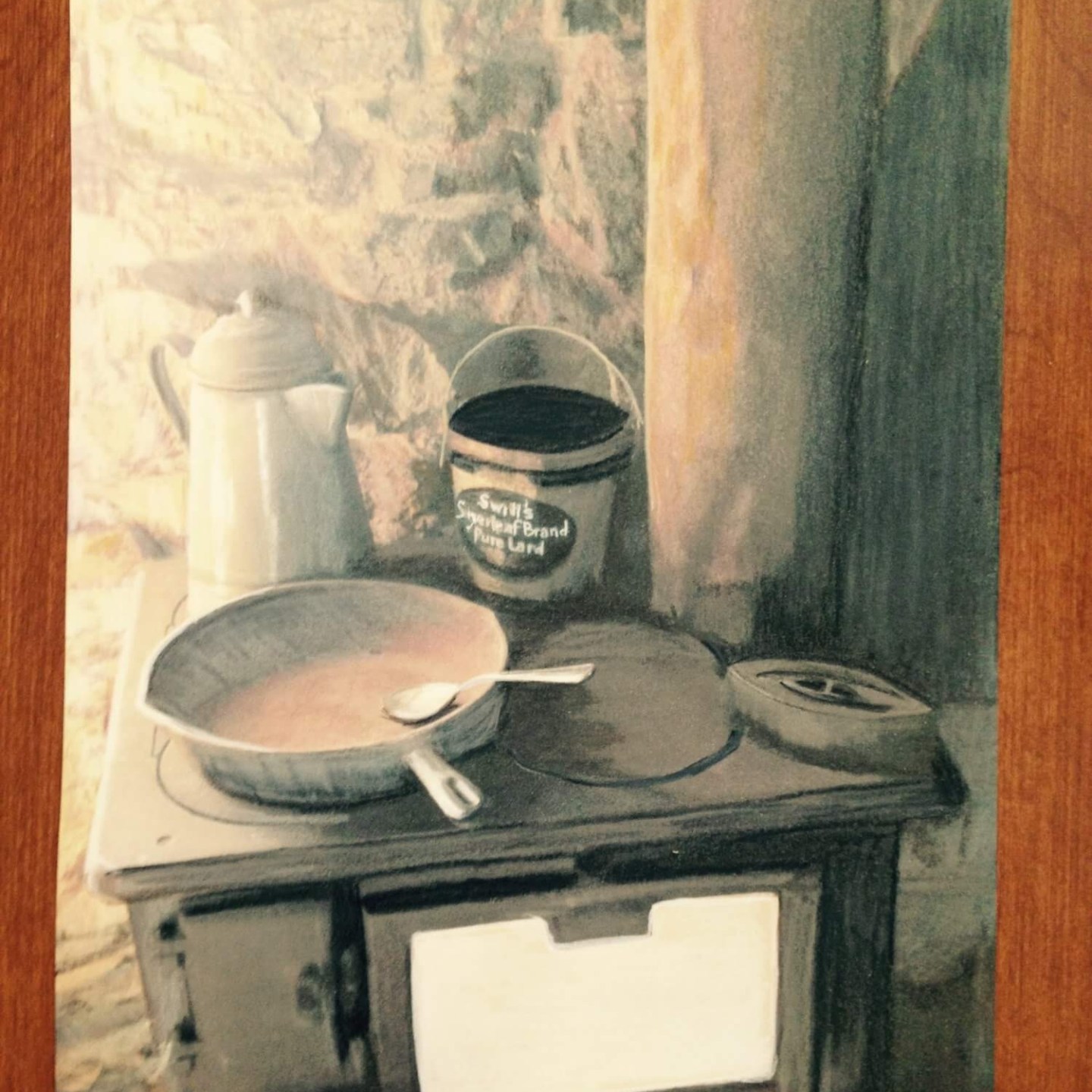During a long and tiring day of working in the cold, dark mine, I’m sure the miners looked forward to a hot meal and the light of day. The sun shining through the window onto the stove gave a feeling of peace and anticipation important for me, as I created this picture, to remember the families who lived and worked here to create the memories that still remain.